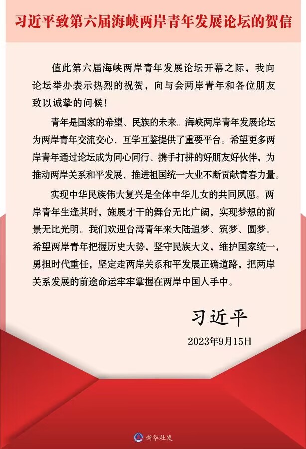 中共中央总书记、国家主席习近平15日向第六届海峡两岸青年发展论坛致贺信。