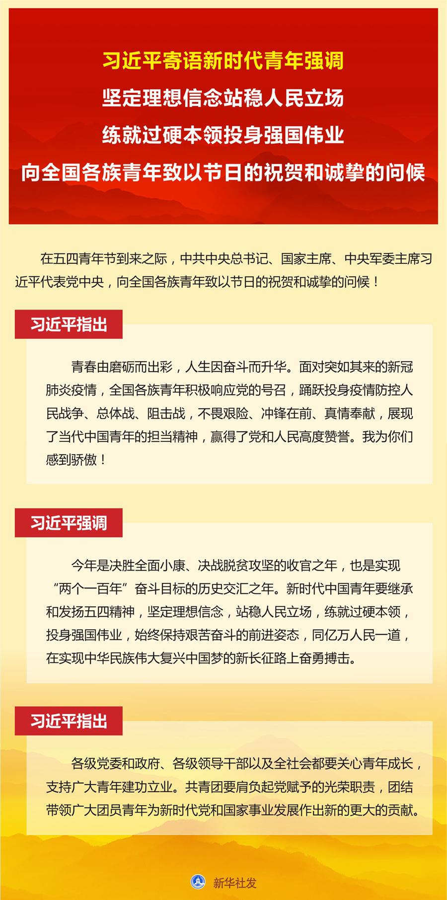 习近平强调,今年是决胜全面小康、决战脱贫攻坚的收官之年,也是实现“两个一百年”奋斗目标的历史交汇之年。新时代中国青年要继承和发扬五四精神,坚定理想信念,站稳人民立场,练就过硬本领,投身强国伟业,始终保持艰苦奋斗的前进姿态,同亿万人民一道,在实现中华民族伟大复兴中国梦的新长征路上奋勇搏击。