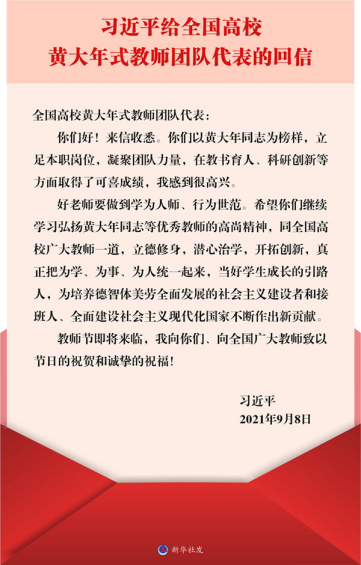 好老师要做到学为人师、行为世范。希望你们继续学习弘扬黄大年同志等优秀教师的高尚精神,同全国高校广大教师一道,立德修身,潜心治学,开拓创新,真正把为学、为事、为人统一起来,当好学生成长的引路人,为培养德智体美劳全面发展的社会主义建设者和接班人、全面建设社会主义现代化国家不断作出新贡献。