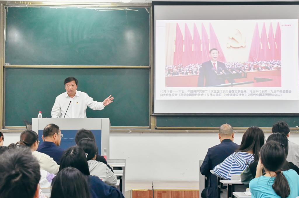 金先龙从“新成就、新形势、新任务、新使命”四个方面全面梳理了党的二十大报告的主要精神,深刻阐明了十九大以来五年的重大成就和新时代十年的伟大变革,深度剖析了当前面临的国内外形势,深入解读了中国式现代化的内涵特征、本质要求和主要目标任务。讲到当代青年的责任和使命时,金先龙例举了新时代优秀青年的先进事迹,指出当代中国青年生逢其时,施展才干的舞台无比广阔,实现梦想的前景无比光明,并勉励广大师生要心系祖国,志存高远,脚踏实地,在奋斗中创造精彩人生,为祖国和人民贡献青春和力量。