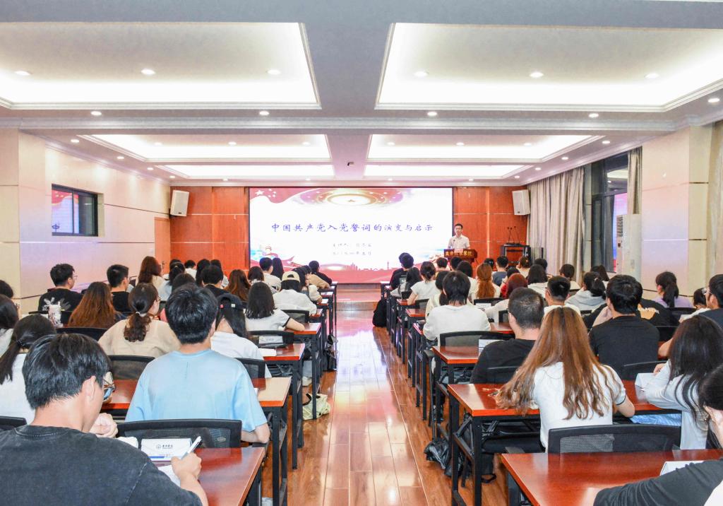5月26日晚,太阳成集团tyc9728党委副书记、纪委书记翁添富为学院第十八期业余党校学员作《中国共产党入党誓词的演变与启示》专题党课,全体业余党校学员参加。