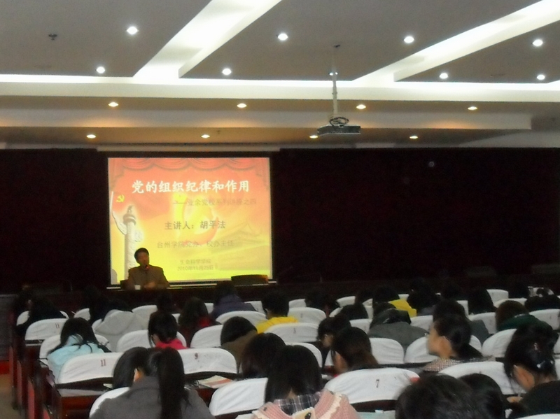 校办胡老师以党的组织纪律和作用为主题,围绕着党的思想作风及个人的发展展开了阐述。他指出党的思想指导党员的发展,党的纪律规范党员的人生。作为新时代的大学生,应先从思想上入党,认识党的特征,形成良好的学习风气。另外,还要积极参加社会实践,多方面获取信息。胡平法老师结合自身经历,深入浅出,以党的思想教育学生,以党的先辈鼓励学生。最后,胡老师把胡锦涛书记的八句箴言送给在场的学生,以资勉励。