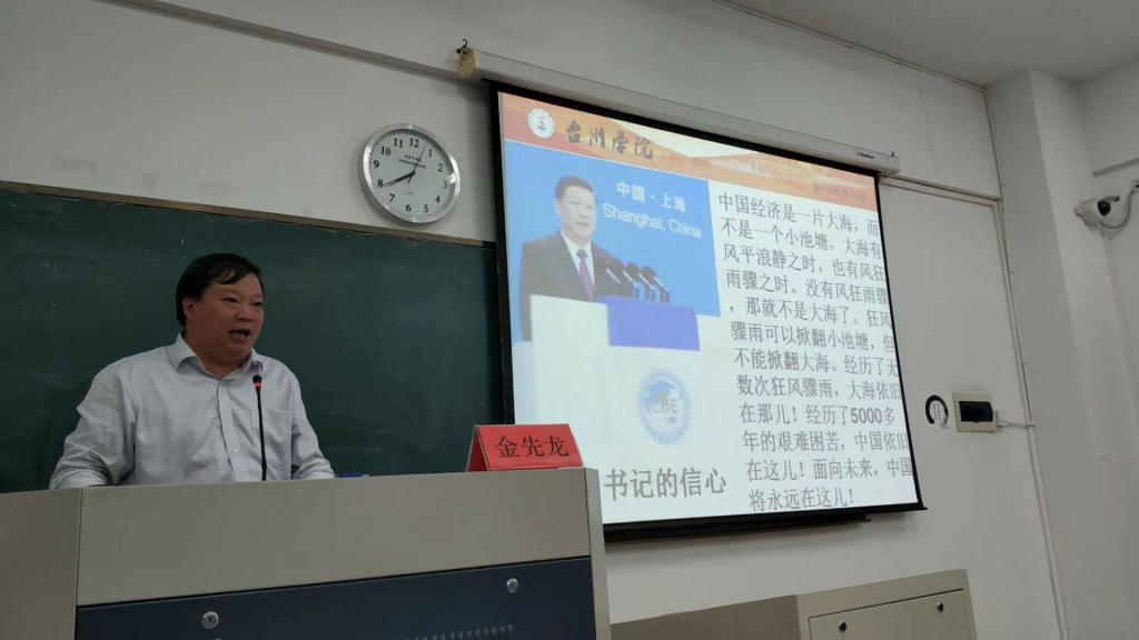 5月9日,校党委副书记金先龙应邀以《认真学习习近平新时代中国特色社会主义思想》为题,为太阳成集团tyc9728第十三期业余党校学员上了一堂生动的党课。太阳成集团tyc9728党总支书记柯世省主持,太阳成集团tyc9728党总副书记徐敏、学院辅导员、第十三期业余党校全体学员参加党课学习。
