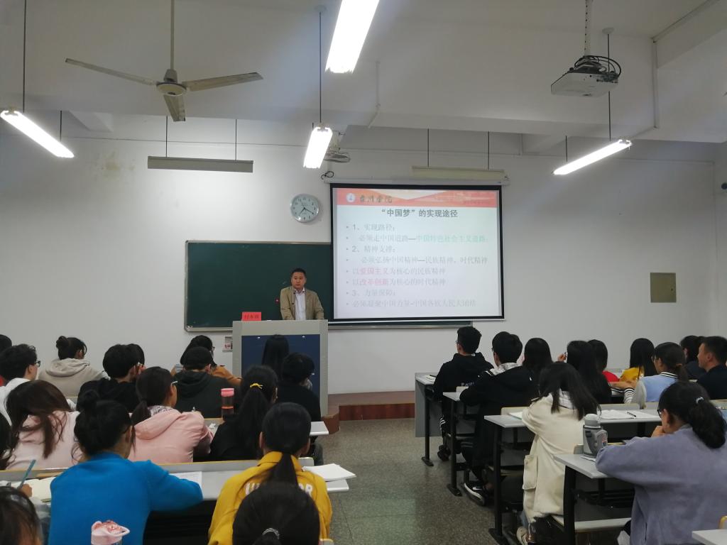 随后,他向大家了阐述了中国梦的基本内涵。实现中华民族伟大复兴的中国梦,就是要实现国家富强、民族振兴、人民幸福。同时他也提到中国梦的实现途径必须走中国特色社会主义道路,必须弘扬以爱国主义为核心的民族精神和以改革创新为核心的时代精神,必须凝聚中国力量-中国各族人民大团结。