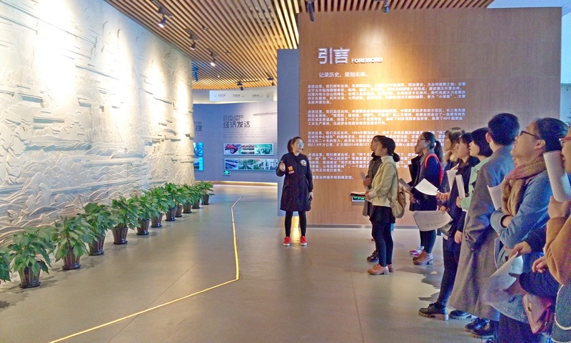 走进台州城市规划展示馆映入眼帘的是台州全景浮雕墙,在讲解员的解说下,台州市政府大楼、临海古长城、天台国清寺、温岭石塘和大神仙居等台州各县市区特色地表景观变得极具魅力。除序厅外,陈展分为印象台州、山海台州、活力台州和展望台州四个展厅,展厅以城市规划为主题,突出台州特色,在讲解员的带领下,同学们更深入地了解了台州这个城市背后的精彩故事。在“文脉传承”展区,同学们通过“佛宗道源”、“人文荟萃”、“山海情韵”等板块,更加具体深入地领略了台州源远流长的历史文化。展馆内不仅采用平面展示模式还采用了高科技手段,将天地图、3D影像、多通道投影等融入多项展示环节,近一千平方米的台州城市规划总体模型大沙盘和超大LED影片交相呼应无不使同学们叹为观止,而“数字沙盘”展现的台州未来“环绿心组团式城市”空间形态更是形象生动的向同学们展示了一个全新的台州。