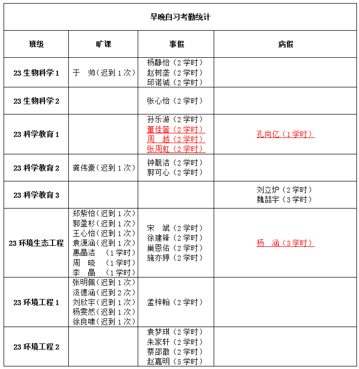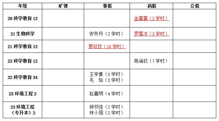希望各班考勤负责人员认真校对,若有错误,请到学生工作办公室(D-371室)吴政浩老师处反映,以便及时纠正。