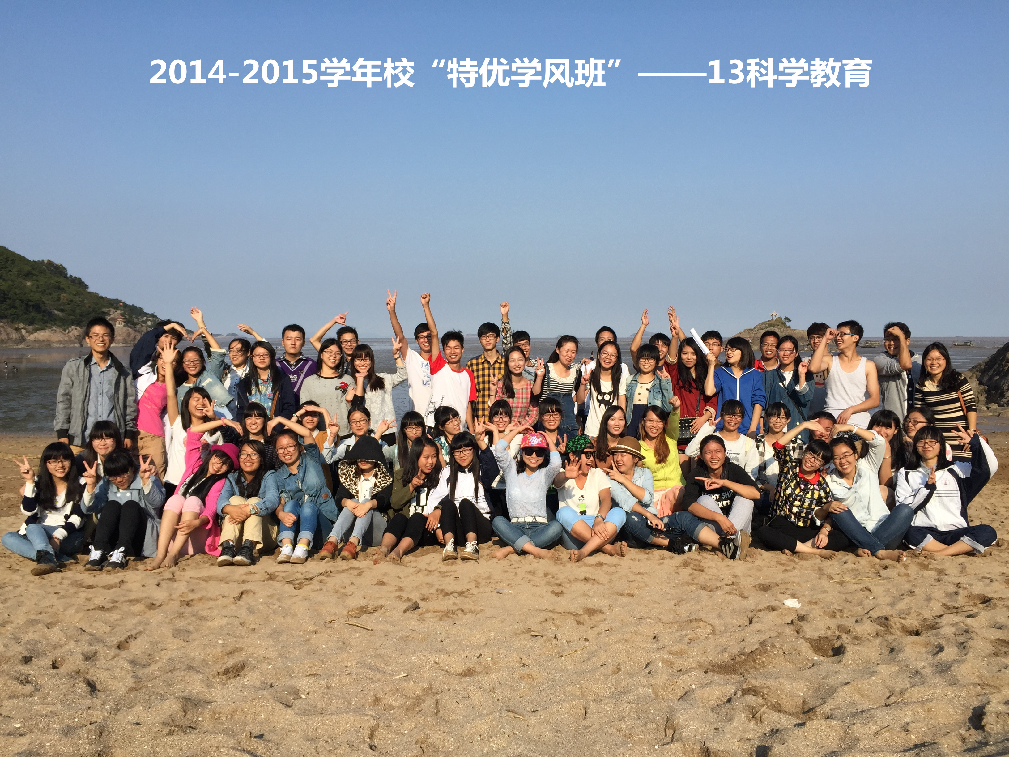 慎思,打造独特班级文化。班级实行分级管理,建立健全班训、班规、班徽和班服等。笃学,提出多元特色举措。专业知识学习采取线上—线下,QQ群讨论,学习帮扶小组等形式,勇攀成绩高分。2014学年班级平均学分绩点高达3.02,计算机二级通过率为79.6%,英语四级达80.6%,普通话为93.5%,毛笔字通过率高达100%。科研实践秉承早立课题,早进实验室,早出成果的“三早”理念,大力培育科研能力。目前,已有24项国家级、省级等课题立项,科研经费高达8万余元,已发表SCI等学术论文两篇。教学实践通过三分钟演讲,十五分钟说课,微课制作等活动不断夯实教学技能,并在师范生即席演讲比赛共7人获奖,占学院获奖人数78%。尚行,丰富多彩第二课堂。班级同学积极参加校园活动,学科竞赛,文体类比赛等共计200余人次获奖,志愿服务高达700余学时。班级荣誉硕果累累,多次获校先进团支部、校微博征集大赛一等奖、校团文化PK大赛二等奖等12余项佳绩。