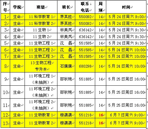备注:1、2012级大学生体质测试室外项目具体由各班体育课任课老师安排测验2、因特殊原因,已申请免修或缓考的同学,如室外项目仍不能参加者,学校届时会统一安排室内和室外项目的补考工作。