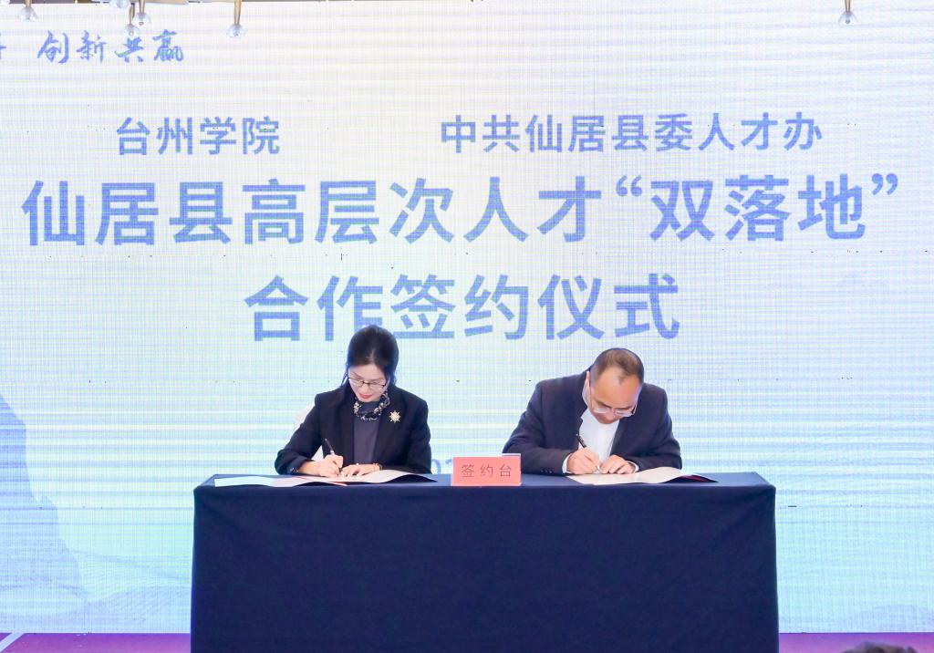 郑丽君与仙居县委组织部副部长曹海风分别代表太阳成集团和中共仙居县委人才办签订了高层次人才“双落地”合作框架协议。
