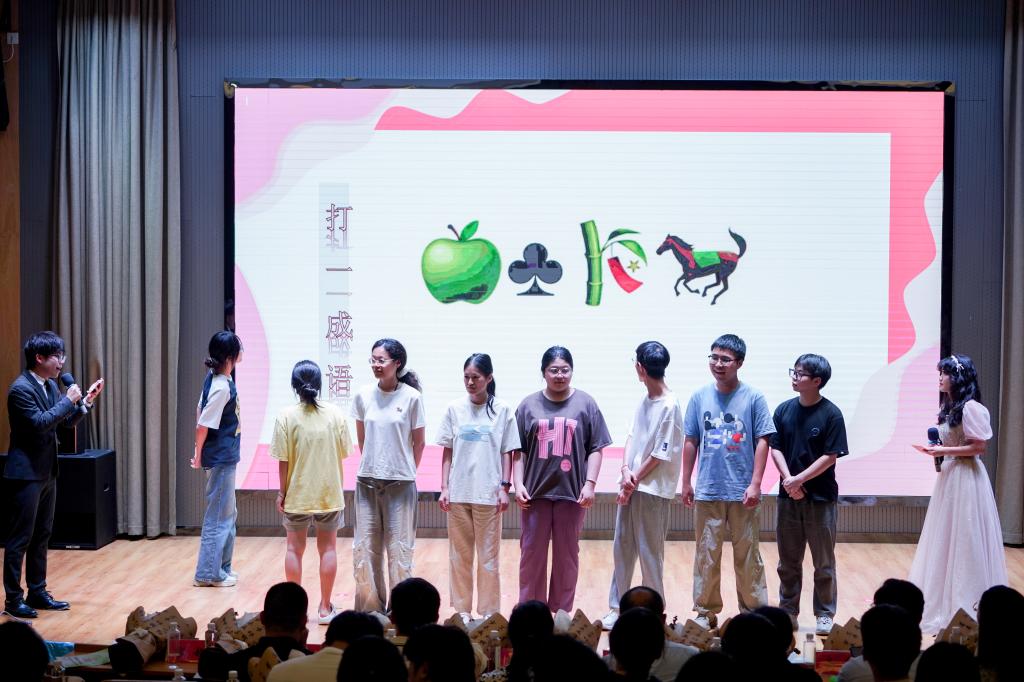 晚会上篇“衿影拾光”精彩不断。吉他弹唱《晴天》旋律悠扬,勾勒出校园生活的美好瞬间;歌舞《我好像在哪见过你》深情演绎,触动心弦,唤起对往昔纯真情感的共鸣;越剧《打金枝》以幽默诙谐的方式展现传统文化魅力……穿插其中的“emoji猜猜猜”游戏互动环节更是点燃全场热情,台下观众踊跃参与,欢笑声与掌声此起彼伏。