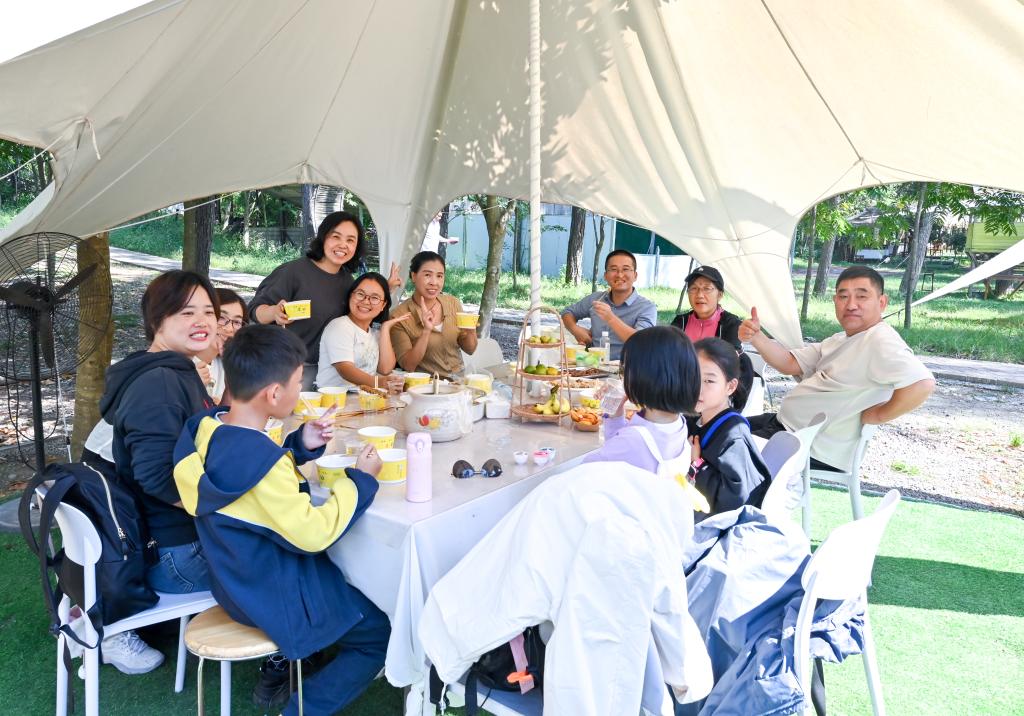抵达营地后,清新的空气瞬间洗去了舟车劳顿,永安溪旁秋色连绵,老师们迅速融入这片自然秋意之中。自助烧烤环节,“主厨”们在炊烟袅袅中各显身手,炭火噼啪作响,香气四溢,很快一串串金黄焦香的烤肉便摆上餐桌。大家围坐在一起,品尝着美食,交流着工作与生活的点滴。孩子们则聚在一起,分享着各种零食、水果与点心,轻松惬意的氛围弥漫在整个营地。中午咸香软糯的仙居特色咸酸饭搭配柴火慢炖的鸡汤,地道的农家风味让老师们赞不绝口,深刻感受了台州本土的饮食文化魅力。