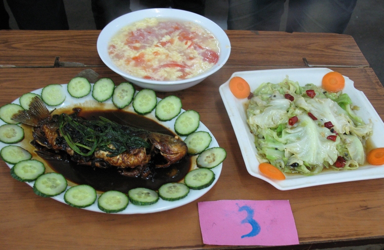 比赛现场热火朝天,大家信心满满、兴致高昂,选手们各彰其才、各显神通。生火、洗锅、切菜,雕花、翻炒……各队选手们分工得当、配合默契。蒸、煮、煎、炸,各种烹饪方法轮番上演,浓浓香味也在紧张激烈的比赛中逐渐弥漫开来。红烧鲫鱼、糖醋排骨、可乐鸡翅、葱香虾汤、日本寿司、柠檬口菇……各式各样的菜肴点缀着各色时令水果,着实让评委和观众们大饱口福。个性的造型、鲜艳的颜色、深远的蕴意,每一道菜都凝聚了同学们的无尽创意和精湛的厨艺。最终,作品“Dove”凭借着鲜美的口感和独到的创意摘得桂冠。