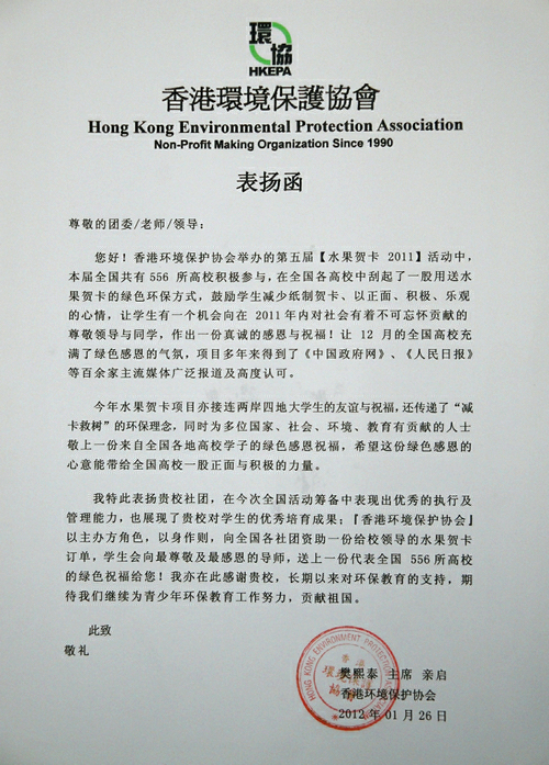 3月27日,太阳成集团tyc9728分团委、学生会收到一封来自香港的特别信函。我校环保协会在香港环境保护协会主办、中国高校环境保护协会协办的第五届“水果贺卡2011”活动中,荣获“全国优秀社团奖”,刘思雨、吴佳伟及陶晶晶等3位同学荣获“全国优秀社团负责人管理成就奖”。