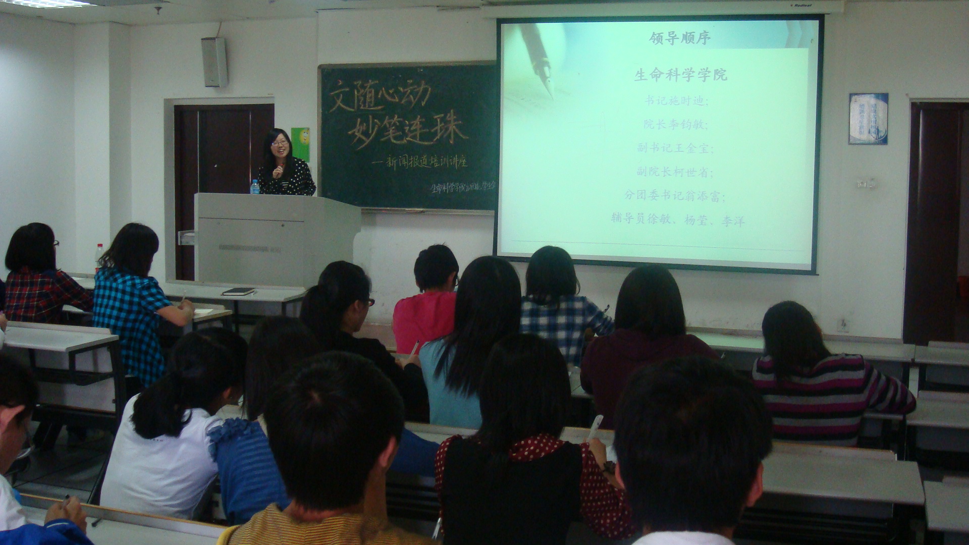 讲座中,袁菱婧首先介绍了新闻报道的基本格式和框架,以及一些基本的注意事项。随后,她结合各类活动的新闻报道实例,详细地分析撰写报道中常见的一些错误并予以纠正,其中还穿插互动环节,让同学们找出例子中的不当之处,现学现卖,灵活运用。最后,主讲人希望同学们把握新闻报道的严谨性和时效性,主体内容分清主次,用词做到精炼恰当。台上,主讲人详细分析,深入浅出地讲解,台下,同学们认真听讲,仔细全面地摘录。培训讲座在现场热烈掌声中圆满结束。