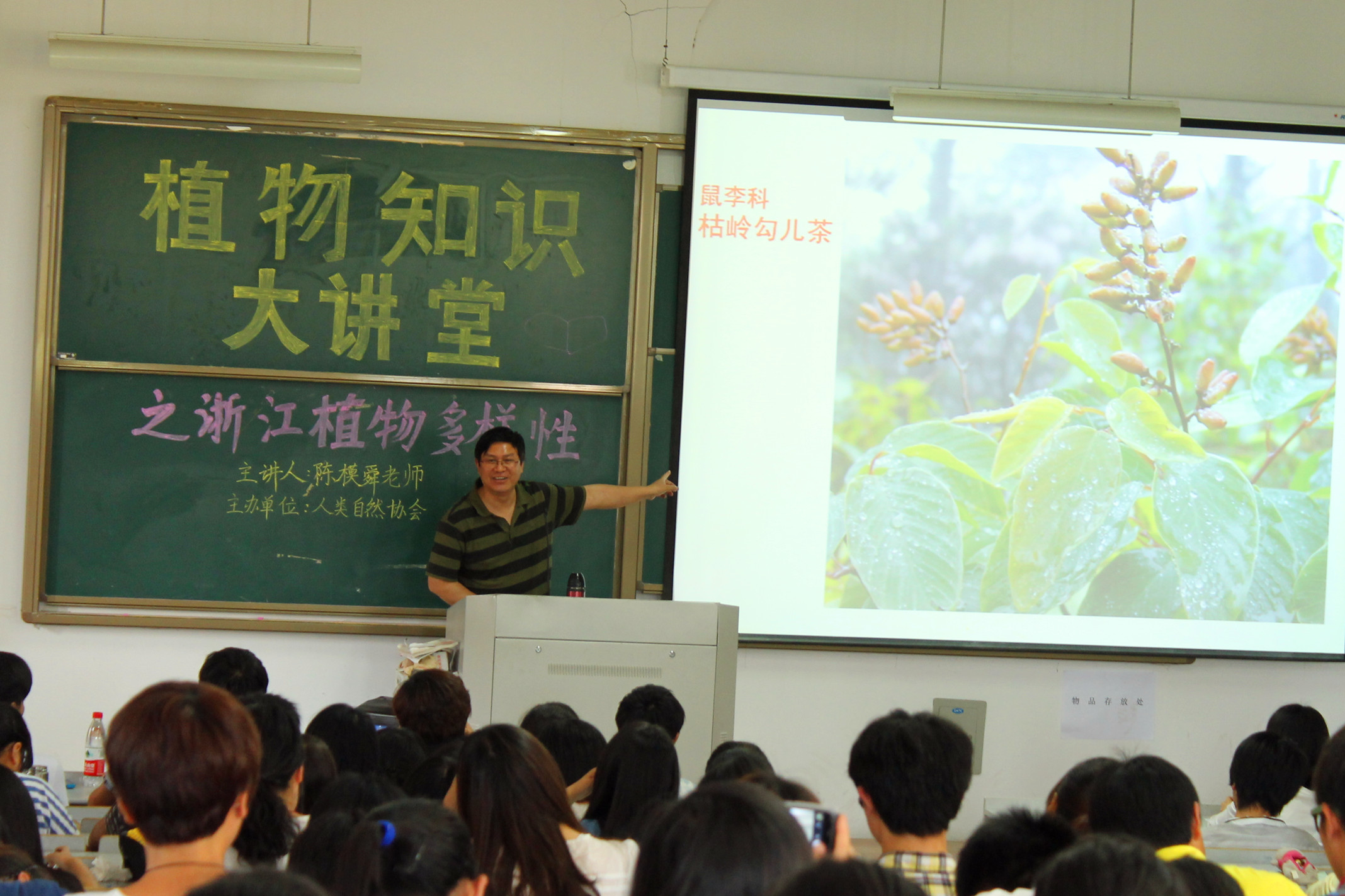 讲座伊始,陈老师首先就天台山的相关植物做了简单的介绍,并根据海拔高度对这些植物进行了分类。他运用各种逼真的图片及凭借自己的科研成果绘声绘色的对天台山上的一些濒危植物做了详细的讲解,带给了同学视觉和听觉上的双重享受。此后,陈老师不仅对比性的介绍了木兰科、鼠李科、蔷薇科等特色植物,还对浙江省的植物分布情况作了全面阐述,进一步加强同学们对植物的认知程度,同学们认真听讲并仔细地作了笔记。在最后的互动环节中,同学们踊跃提问,陈老师耐心回答学,讲座在师生间好学求知的氛围中圆满结束。