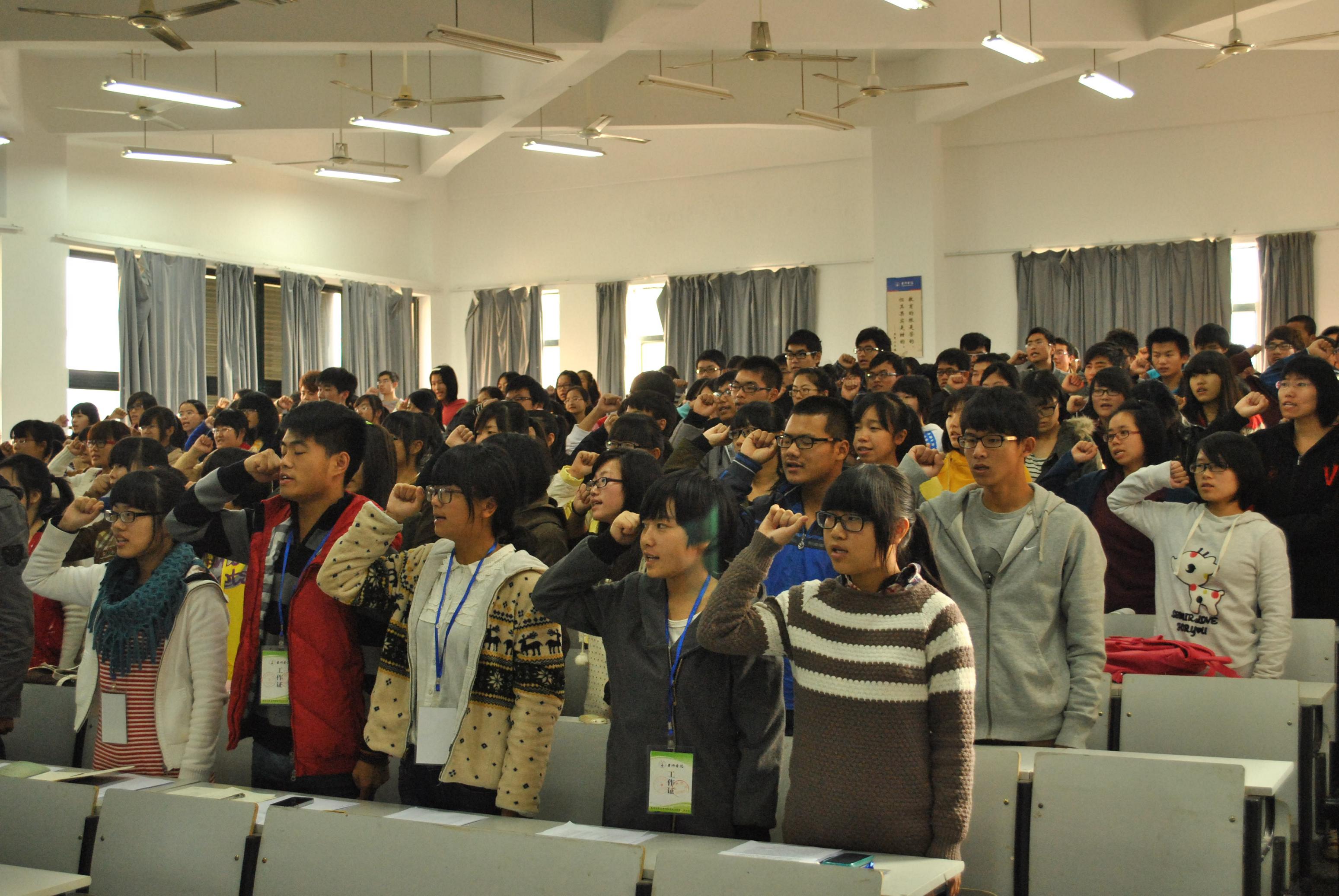 大会首先通过图片与视频向志愿者展示了过去一年来学院志愿者队所取得的辉煌成绩,并对志愿者队“奉献、友爱、互助”的精神团体做简要阐述。随后,李老师希望广大志愿者提高自身文明素质、学会谦逊礼让,发扬志愿精神,积极主动参与志愿工作;周同学则对做好一名运动会志愿者提出了指导意见并传授了宝贵经验;学院第六届团学会志愿者队副队长葛晓斐同学鼓励同学们积极参与到志愿者活动当中,奉献青春血汗、完善成长经历。最后,全体志愿者在庄严起立的宣誓中结束本次大会,一句句令人亢奋的话语、一幅幅庄重的表情,深刻体现志愿者的赤诚热情。