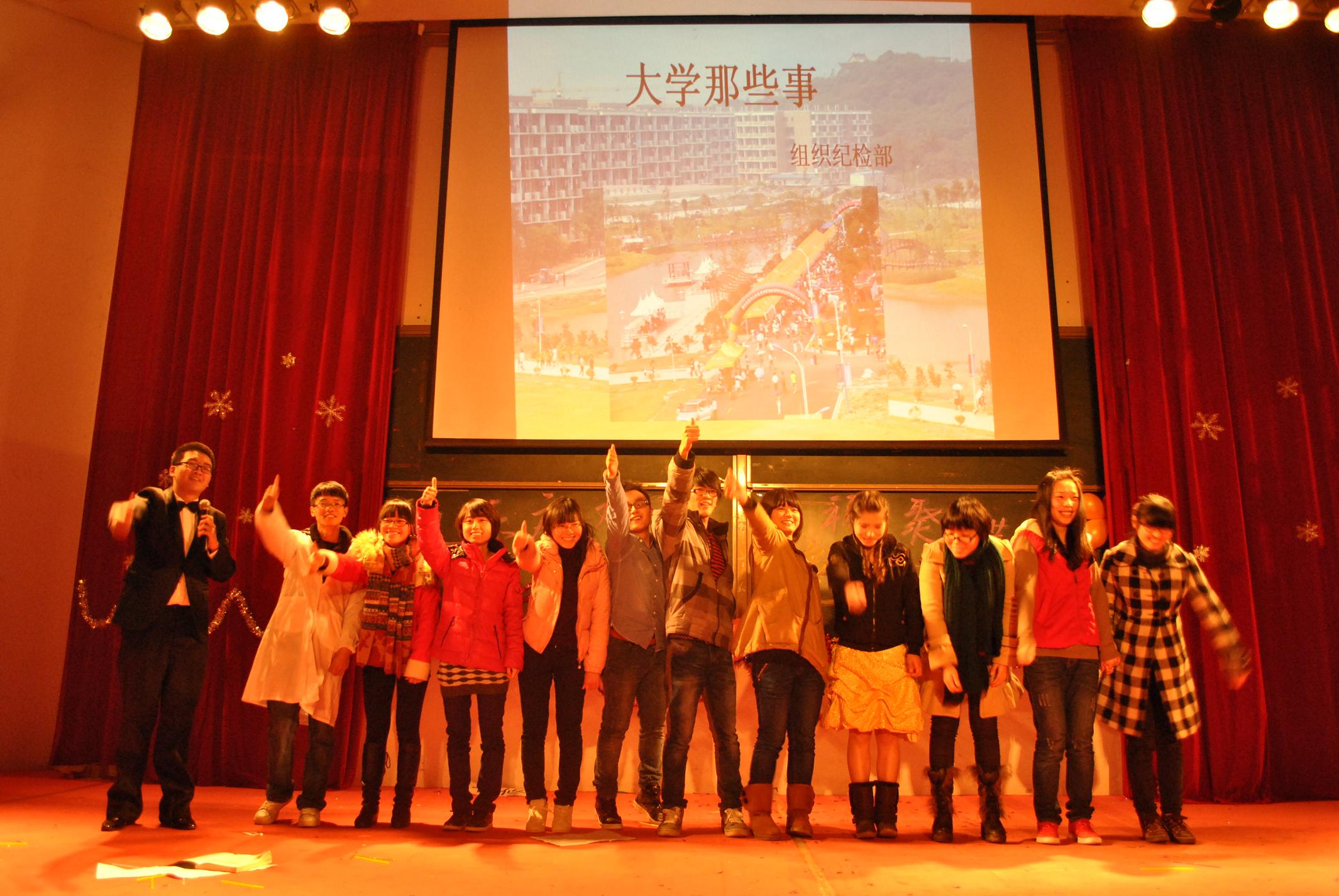 晚会在团学会主席团带来的开场秀《喜庆联欢唱》中来开帷幕,动人的歌喉,唯妙的嗓音,点燃了全场观众激情。晚会所有节目由团学会各部门、协会精心打造,形式多样,内容纷繁,有可爱动感的舞蹈,时尚反窜的T台秀,颠覆印象的小品,诙谐励志的哑剧等。期间,作为神秘嘉宾的范老师与翁老师忍不住蠢蠢欲动的歌喉高歌了一曲《你是我心内的一首歌》,两人深情对唱,嗓音如天籁回旋,绕梁三日而不止。压轴出场的《宣传style》,惊艳的鸟叔造型,活力四射的骑马舞彻底high翻全场,把气氛推向了最高潮。晚会最后在全体委员们《相亲相爱》中落幕,寓意生命大家庭团结齐心、协力奋进。