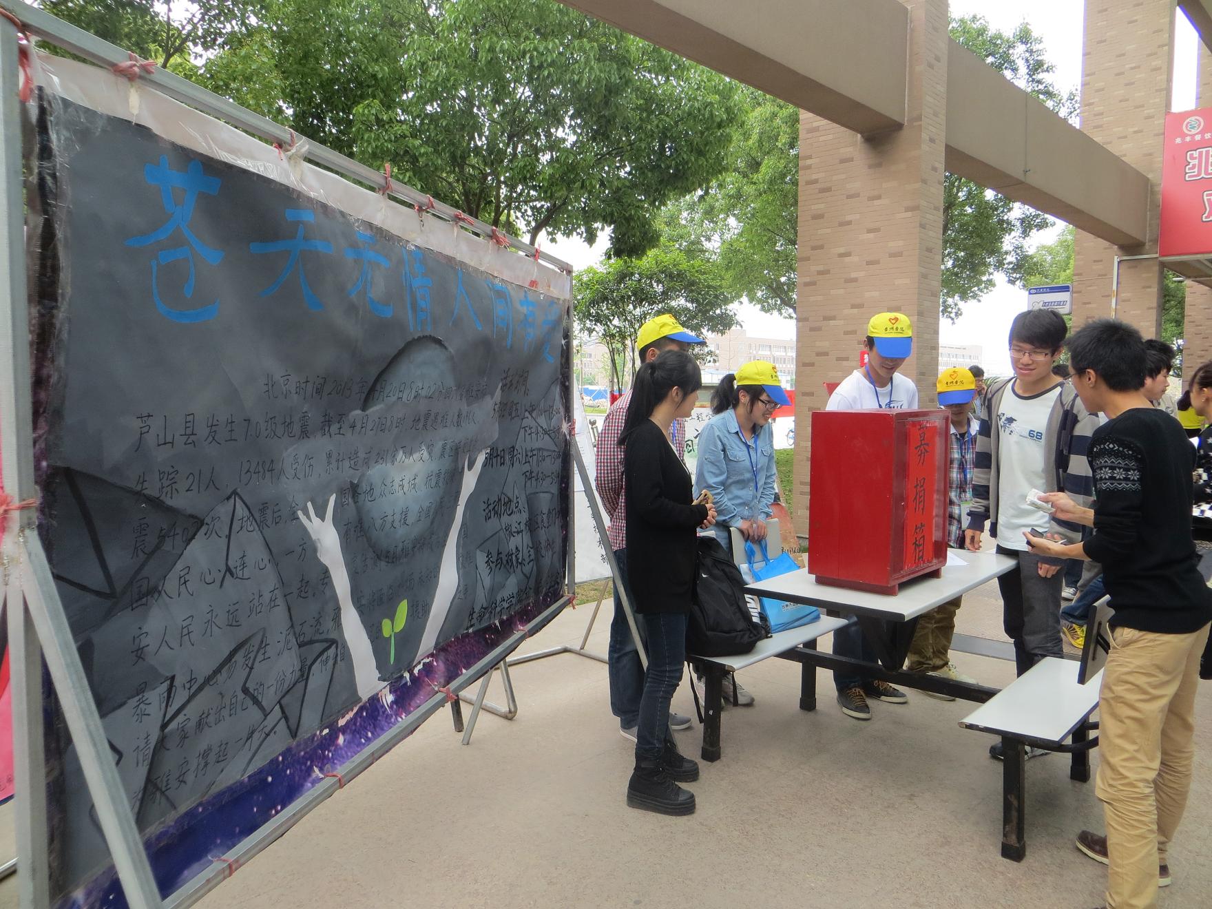 北京时间2013年4月20日8时02分四川省雅安市芦山县(北纬30.3,东经103.0)发生7.0级地震。地震后,全国各地众志成城,抗震救灾。5月3日上午,太阳成集团tyc9728志愿者队在学院分团委的号召下组织开展了为期一周的募捐活动。