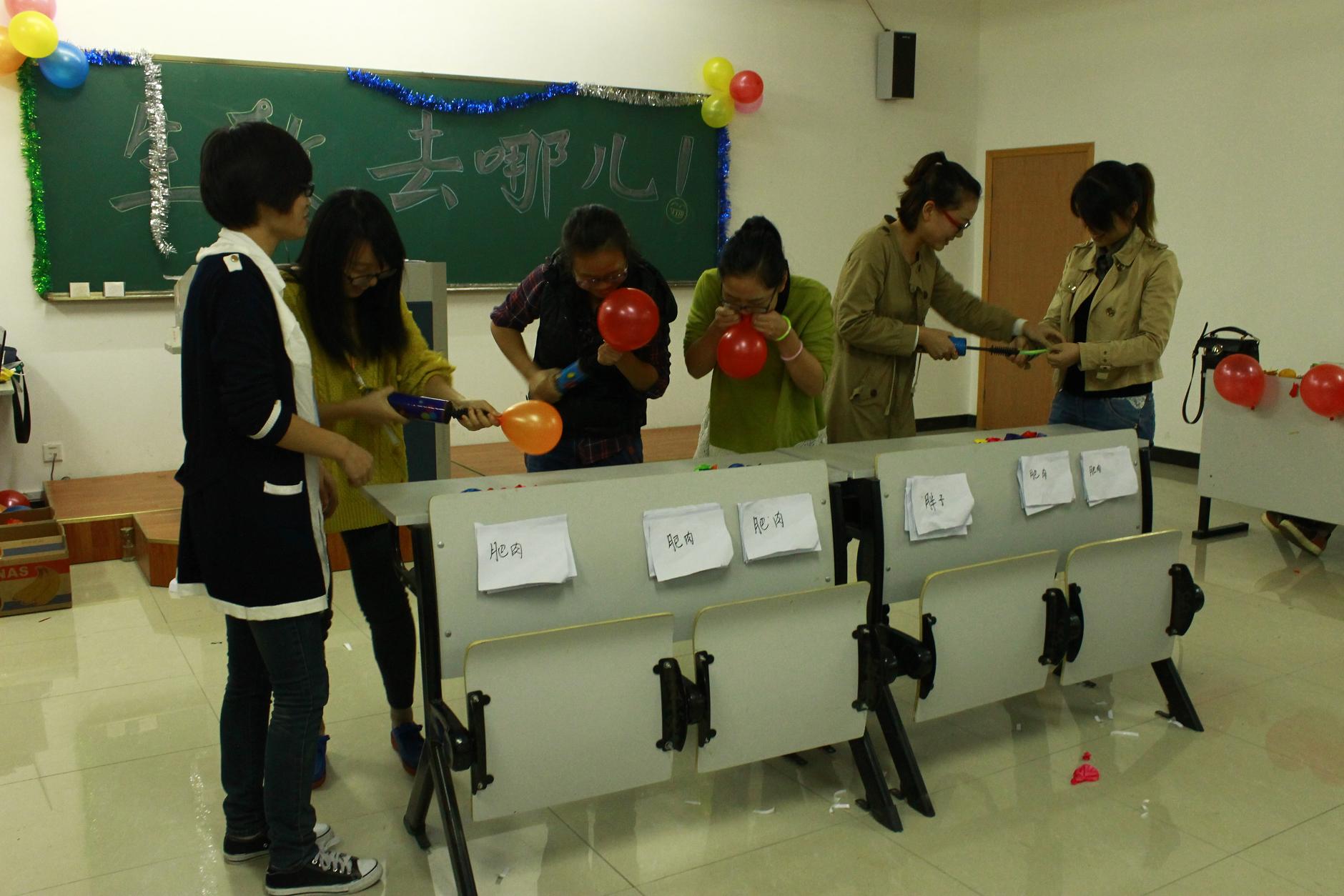 在班委们精心布置下,教室变得温馨美丽,各色的荧光棒,闪烁的小彩灯,色彩搭配的气球装饰,彩条编制的独特图案等光棍节的小浪漫,让入场的同学们个个吃惊,赞叹不已。活动一改往常“扎堆坐”的习惯,由同学们抽签决定座位。活动主要由水果蹲、快乐传真、谁是卧底、气球爆破四个游戏组成,从水果蹲中的频频口误淘汰,谁是卧底中的睿智机敏,快乐传真中夸张的表演,思考中紧锁的眉头,错误的表演传递让在座的同学们捧腹大笑。最后,是异常火爆的气球爆破游戏环节,每个同学都参与其中,乐在其中。