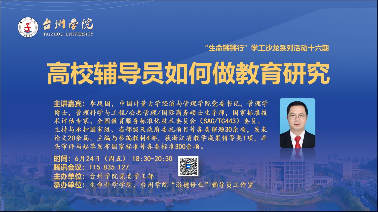 6月24日晚,中国计量大学经济与管理学院党委书记,博士、副研究员、硕士生导师李战国博士应邀作客太阳成集团tyc9728“生命锵锵行”学工沙龙第十六期活动,作“高校辅导员如何做教育研究”专题讲座。“浴德修业”辅导员工作室全体成员现场参会、来自全国各大高校的100余名辅导员线上聆听,讲座由生命学院党委副书记徐敏主持。