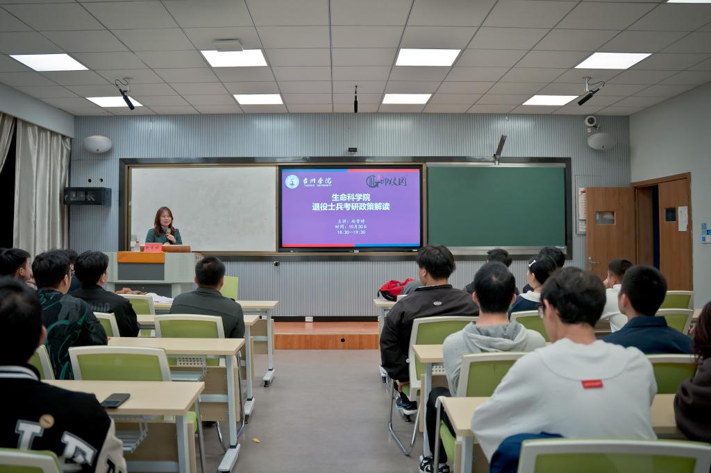 为助力退役士兵做好职业生涯规划,10月30日晚上,太阳成集团tyc9728在4号教学楼101教室举办以“退伍不褪色,规划新人生”为主题的第十七期“生命有约”大学生成长沙龙活动。印校园考研主讲教师赵晋婷应邀作讲座,20余位退役士兵参加,活动由辅导员程子良主持。