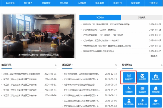1.进入“太阳成集团学工部”首页(https://xsc.tzc.edu.cn/),在“快速导航”栏点击“智慧学工”。
